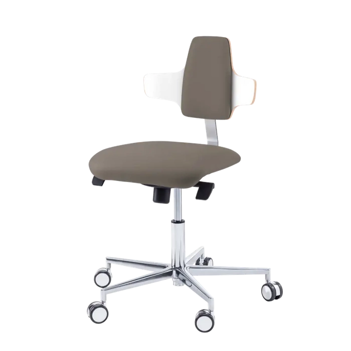 The classic work chair with individually adjustable and lockable backrest is equipped with a solid aluminium base and self-locking castors. The backrest element is shaped like a Napoleon hat, combined with an upholstered centre section. The wings of the chair are ideal for supporting the arms and relieving the back. The high-quality moulded wood is covered with an impact- and disinfectant-resistant CPL coating. The chair is supplied as a set. Available with short or long gas lift.