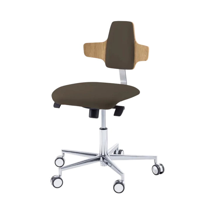 The classic work chair with individually adjustable and lockable backrest is equipped with a solid aluminium base and self-locking castors. The backrest element is shaped like a Napoleon hat, combined with an upholstered centre section. The wings of the chair are ideal for supporting the arms and relieving the back. The high-quality moulded wood is covered with an impact- and disinfectant-resistant CPL coating. The chair is supplied as a set. Available with short or long gas lift.