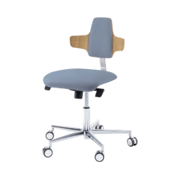 The classic work chair with individually adjustable and lockable backrest is equipped with a solid aluminium base and self-locking castors. The backrest element is shaped like a Napoleon hat, combined with an upholstered centre section. The wings of the chair are ideal for supporting the arms and relieving the back. The high-quality moulded wood is covered with an impact- and disinfectant-resistant CPL coating. The chair is supplied as a set. Available with short or long gas lift.