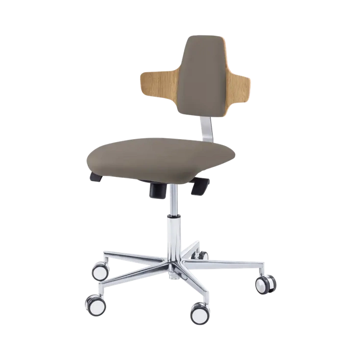 The classic work chair with individually adjustable and lockable backrest is equipped with a solid aluminium base and self-locking castors. The backrest element is shaped like a Napoleon hat, combined with an upholstered centre section. The wings of the chair are ideal for supporting the arms and relieving the back. The high-quality moulded wood is covered with an impact- and disinfectant-resistant CPL coating. The chair is supplied as a set. Available with short or long gas lift.