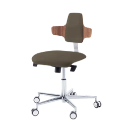 The classic work chair with individually adjustable and lockable backrest is equipped with a solid aluminium base and self-locking castors. The backrest element is shaped like a Napoleon hat, combined with an upholstered centre section. The wings of the chair are ideal for supporting the arms and relieving the back. The high-quality moulded wood is covered with an impact- and disinfectant-resistant CPL coating. The chair is supplied as a set. Available with short or long gas lift.