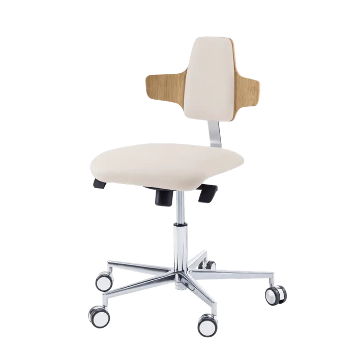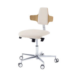 The classic work chair with individually adjustable and lockable backrest is equipped with a solid aluminium base and self-locking castors. The backrest element is shaped like a Napoleon hat, combined with an upholstered centre section. The wings of the chair are ideal for supporting the arms and relieving the back. The high-quality moulded wood is covered with an impact- and disinfectant-resistant CPL coating. The chair is supplied as a set. Available with short or long gas lift.