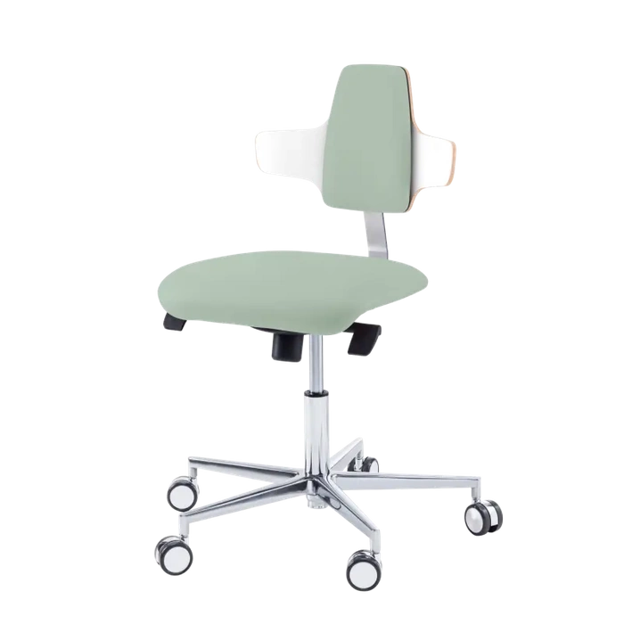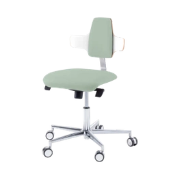 The classic work chair with individually adjustable and lockable backrest is equipped with a solid aluminium base and self-locking castors. The backrest element is shaped like a Napoleon hat, combined with an upholstered centre section. The wings of the chair are ideal for supporting the arms and relieving the back. The high-quality moulded wood is covered with an impact- and disinfectant-resistant CPL coating. The chair is supplied as a set. Available with short or long gas lift.