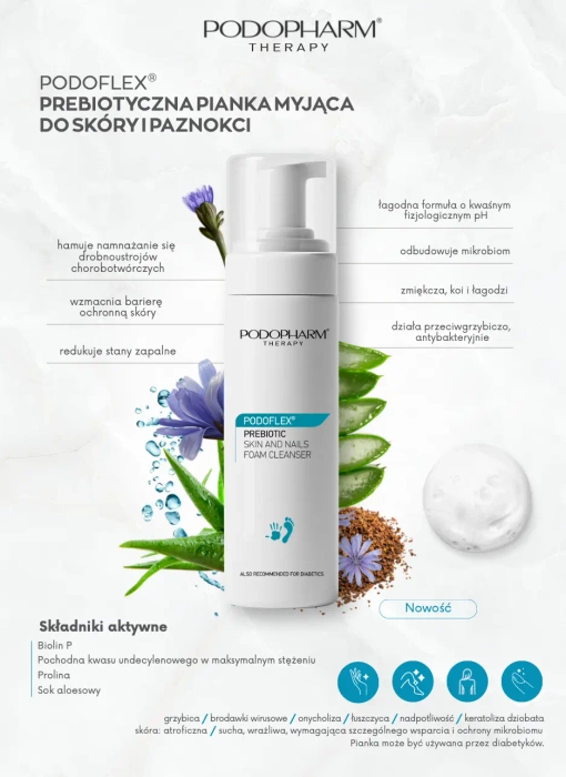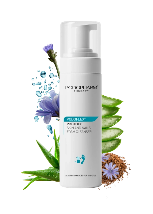 PODOFLEX® is a gentle cleansing foam designed for daily hygiene of the feet and nails. Its prebiotic formula protects the skin’s microbiome, restores natural pH balance, and supports dermatological and podiatric therapies.