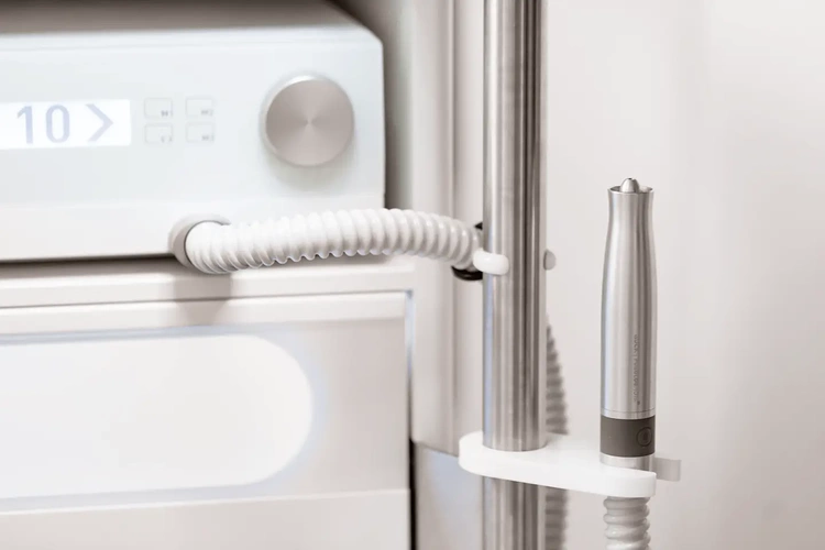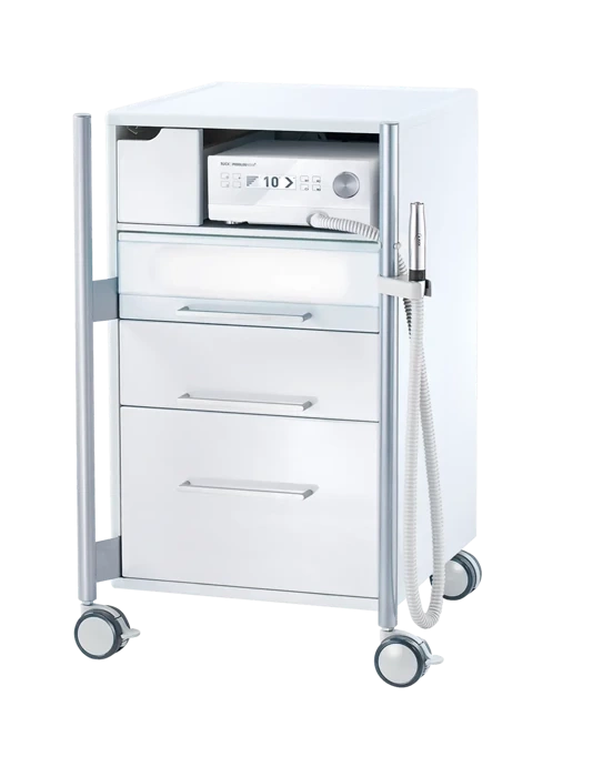 - Uchwyty szuflad jak i boczne prowadnice są w kolorze satynowym tworząc ze sobą zgrany komplet. Prowadnice boczne są zintegrowane z wszystkimi dodatkami np uchwyt do pióra frezarki, tacki na narzędzia, kosz na odpady med. albo lampy z lupą Podolog Circle XL Classic lub Professional.