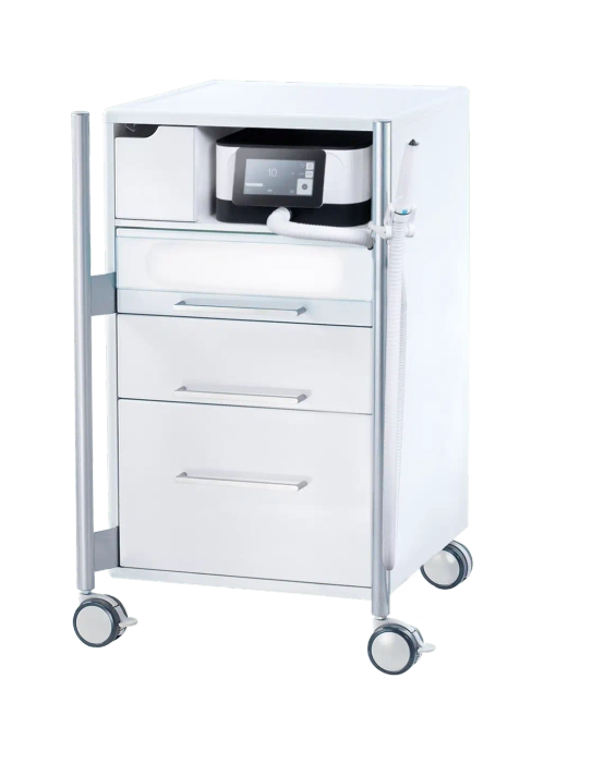 - Szafka podologiczna jest na mocnych, gumowych kółkach (konstrukcja metalowa i łożyska), które można wykorzystać do przemieszczania szafki w dowolne miejsce w gabinecie podologicznym. Kółka mają hamulec.