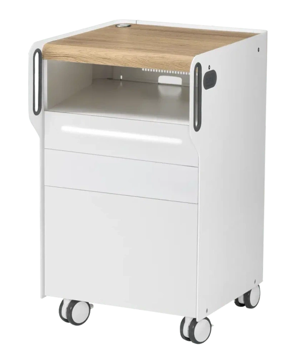 • Funkcjonalna szafka podologiczna ROOM move S - kompaktowy model z wnęką na frezarkę, 3 szufladami LED i blatem CPL. Świetnie sprawdza się w małych gabinetach. Mobilna, nowoczesna, z możliwością mocowania akcesoriów magnetycznych.