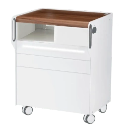 Model ROOM move M wyposażony jest w trzy pojemne szuflady z funkcją Tip-On i systemem Soft-Close, które umożliwiają ciche i płynne otwieranie oraz zamykanie. Szafka podologiczna posiada wbudowane oświetlenie LED. Dostępna jest w wersjach z wnęką na urządzenie po lewej lub prawej stronie, idealnie dopasowaną do frezarek RUCK® Nova Pro, Nova SE lub podolog Nova 3s. Mobilna podstawa na czterech kółkach umożliwia wygodne przemieszczanie mebla po gabinecie.