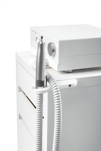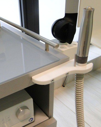 - Można go przykręcić do ściany lub szafki podologicznej w najbardziej wygodnym i dostępnym miejscu dla operatorki frezarki. Bardzo szybki montaż za pomocą dwóch wkrętów, które znajdują się w zestawie z uchwytem.